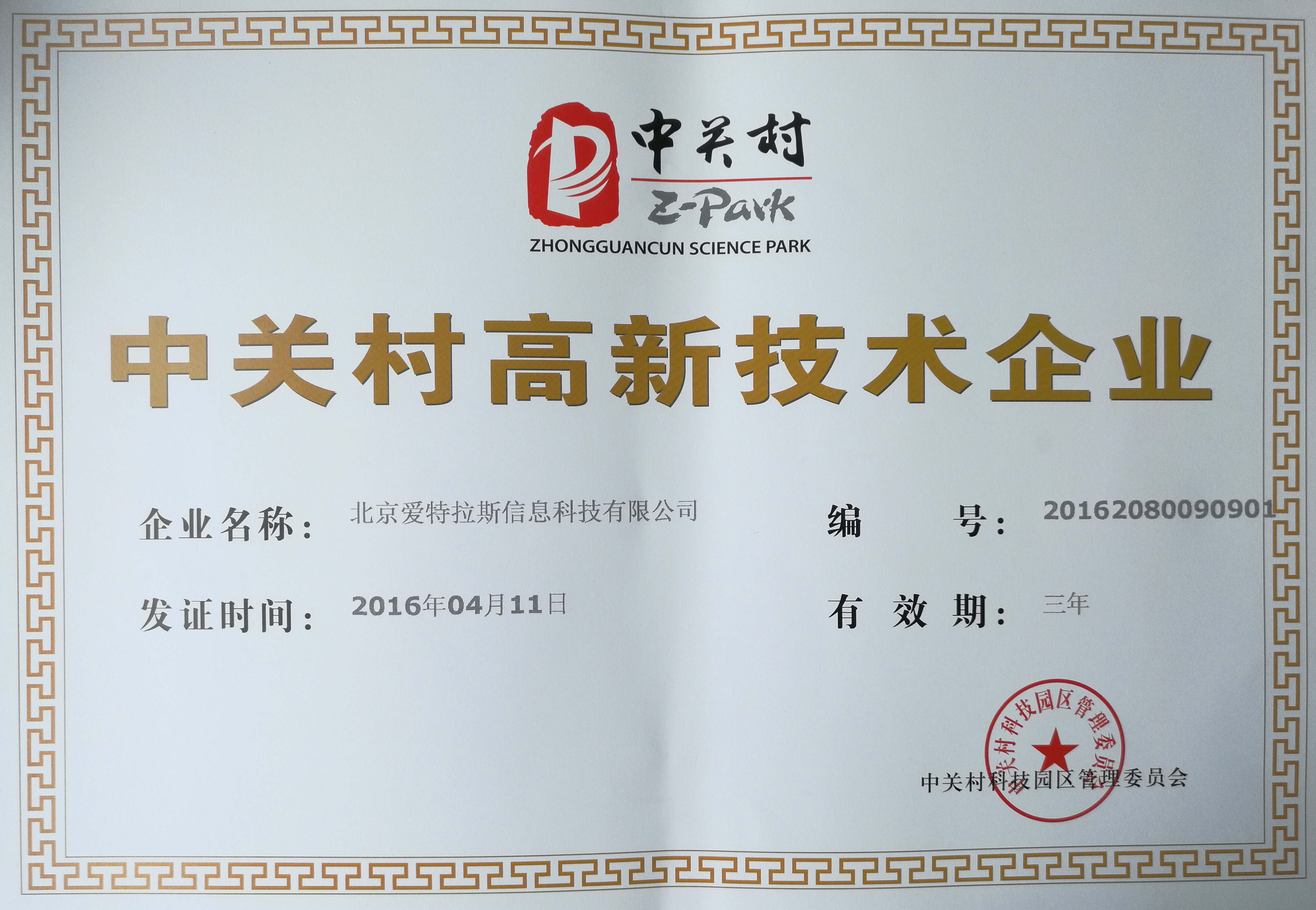 2016年4月11日,北京愛(ài)特拉斯信息科技有限公司在入住中關(guān)村科技園并被認定為“中關(guān)村高新技術(shù)企業(yè)”。高新技術(shù)企業(yè)屬于國家重點(diǎn)支持的具有高成長(cháng)性的創(chuàng )新型企業(yè),具有潛在的科技和創(chuàng )新價(jià)值。獲得高新技術(shù)企業(yè)認證,表明公司具備較強的創(chuàng )新意識、較高的市場(chǎng)開(kāi)拓能力和經(jīng)營(yíng)管理水平,大大提升公司的品牌價(jià)值。