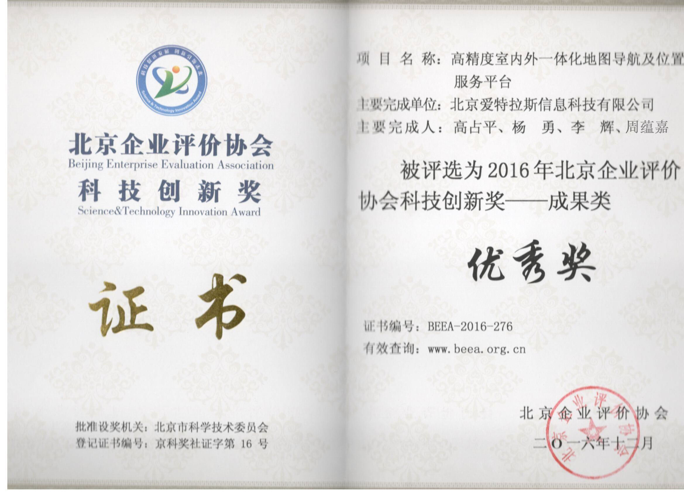 本屆企業(yè)科技創(chuàng )新獎的獲得,不僅是專(zhuān)家組對高精度室內外一體化地圖導航及位置服務(wù)平臺的認可,同時(shí)也是給予北京愛(ài)特拉斯信息科技有限公司的高度贊賞。我公司有此殊榮,必將不懈努力,力爭再創(chuàng )佳績(jì)。