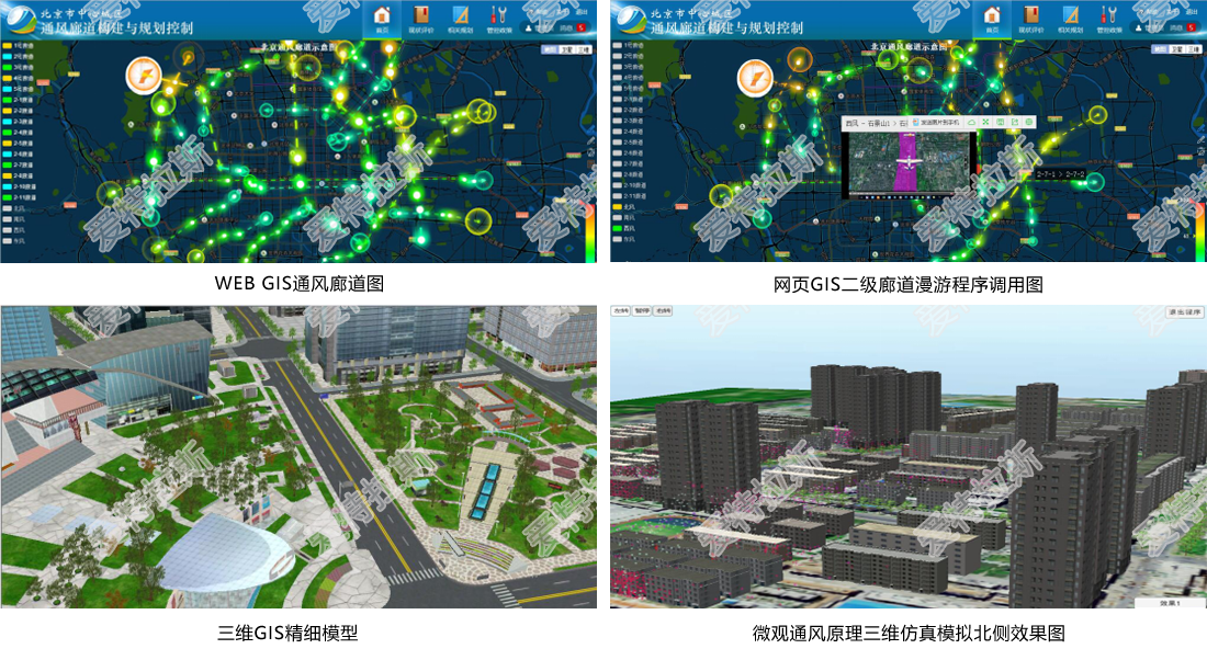 為了更好的呈現北京中心城區通風(fēng)廊道構建成果以及更好的為大眾服務(wù),建設了北京市中心城區通風(fēng)廊道展示系統,本項目采用三維GIS和網(wǎng)頁(yè)GIS的結合,以期更加“完整”、“真實(shí)”、“生動(dòng)”地展現北京市通風(fēng)廊道構建結果和更加“便捷”地為大眾提供服務(wù)。WEB端通風(fēng)廊道展示系統做到網(wǎng)頁(yè)GIS和三維GIS的完美結合,實(shí)現通風(fēng)廊道的發(fā)布與服務(wù).基于空氣動(dòng)力學(xué)原理的通風(fēng)廊道微觀(guān)情況三維模擬,還原真實(shí)的風(fēng)場(chǎng)效果,實(shí)現如臨其境的三維仿真?;谌SGIS系統功能,實(shí)現北京市通風(fēng)廊道系統微觀(guān)三維展示,并利用三維GIS的漫游效果,實(shí)現通風(fēng)廊道宏觀(guān)動(dòng)態(tài)效果。