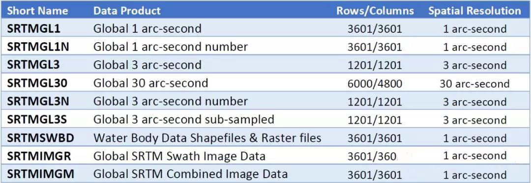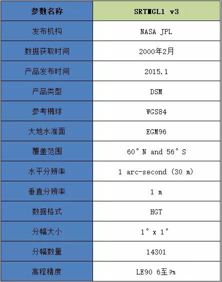 為了繼續保持在全球DEM數據領(lǐng)域的領(lǐng)先,NASA借助最新的項目MEaSUREs (Making Earth System Data Records for Use in Research Environments)著(zhù)手升級SRTM DEM數據產(chǎn)品,這次升級工作又回到JPL手中,JPL接手后先對數據錯誤進(jìn)行了修正,發(fā)布了v2.1版本,隨后發(fā)大招,融合ASTER GDEM v2、USGS GMTED2010、USGS NED(National Elevation Dataset)數據,于2015年10月發(fā)布了SRTM Plus即v3版本產(chǎn)品,SRTM Plus所有數據向全球用戶(hù)免費開(kāi)放下載使用,包括SRTMGL1、SRTMGL3和SRTMGL30三種不同的分辨率的全球DEM數據產(chǎn)品,其基本屬性如下