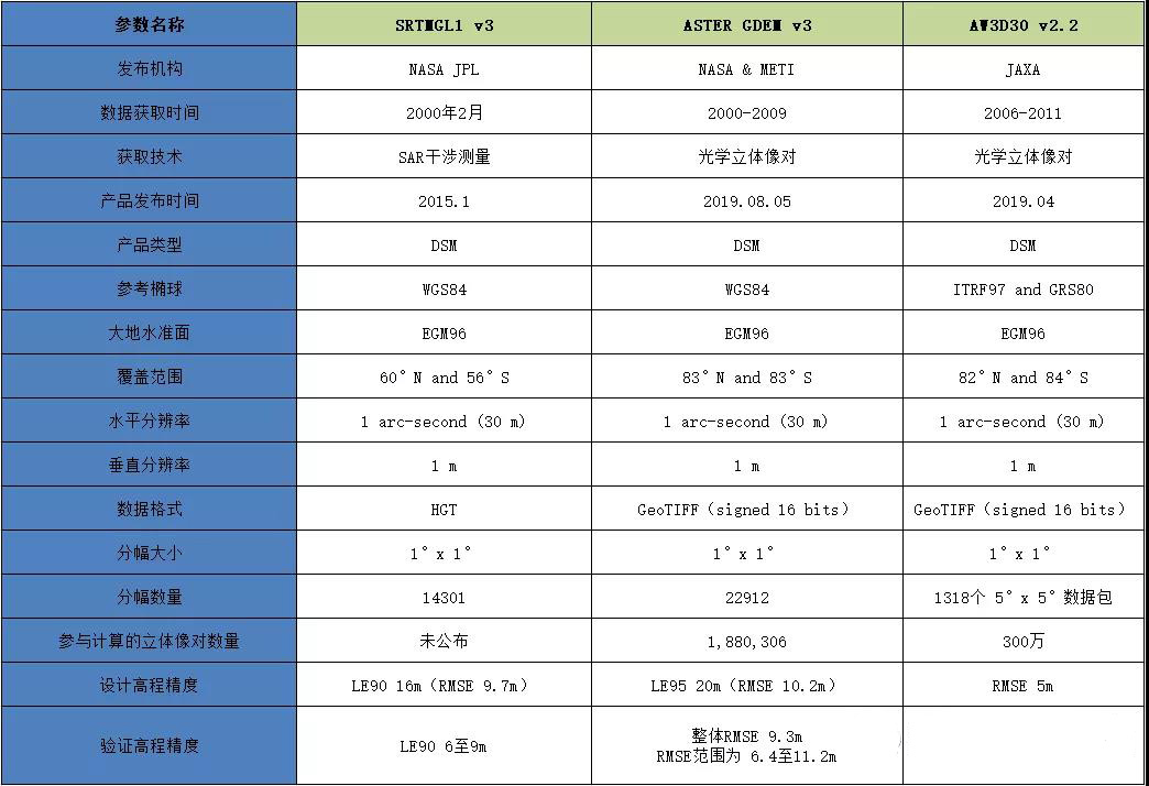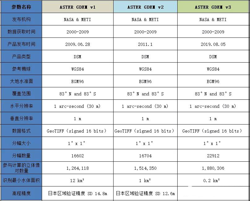 ASTER GDEM三個(gè)版本基本屬性表如下: