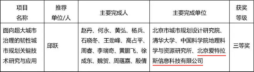 其中,愛(ài)特拉斯參與的《面向超大城市治理的韌性城市規劃關(guān)鍵技術(shù)研究與應用》項目榮獲中國城市規劃學(xué)會(huì )科技進(jìn)步獎三等獎。