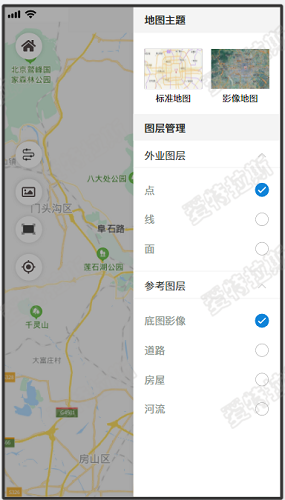 圖層管理模塊主要包含外業(yè)圖層管理和參考圖層管理,外業(yè)圖層主要包含點(diǎn)、線(xiàn)、面、標注圖層的顯示開(kāi)關(guān),參考圖層可以控制參考影像數據、參考矢量數據的顯示開(kāi)關(guān);軟件自帶全國主題矢量和影像地圖提供用戶(hù)參考。